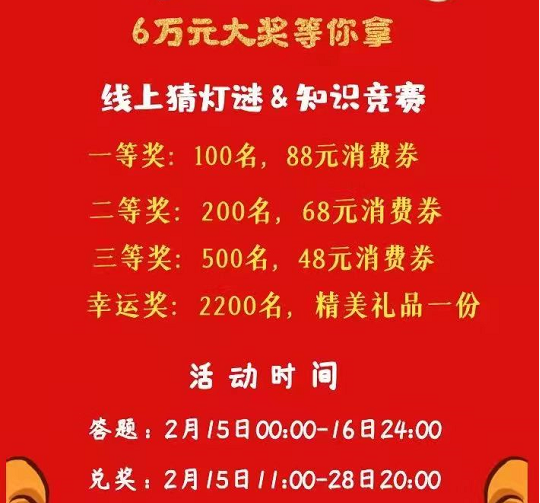 云上职工灯会活动设一等奖100名,奖励88元消费券,二等奖200名,奖励68元消费券;三等奖500名奖励48元消费券;幸运奖2200名,精美礼品1份。广大网友可通过关注“神农架林区总工会”微信公众号,点击底部“职工灯会”进入“猜灯谜和知识竞赛”答题小程序,可参与猜谜答题。