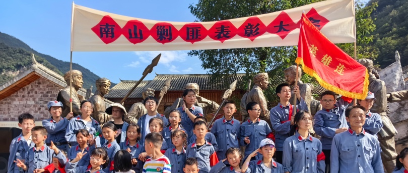 作为“湖北百大红色地标”,古水红色教育基地承载着厚重的革命记忆,《跟着团长打土匪》便取材于解放军在神农架南山剿匪的历史,项目包含《报名参军》《古水练兵》《关门河战斗》《公审大会》《班师回营》五幕情景剧场,游客报名后即可申领服饰与道具,在工作人员扮演的“团长”带领下参加战前动员,伴随着冲锋号在“炮火”轰鸣、硝烟弥漫中前进,跨越掩体向“敌人”发起冲锋,沿途还有“村民”加油鼓劲,全程沉浸式复刻剿匪场景。