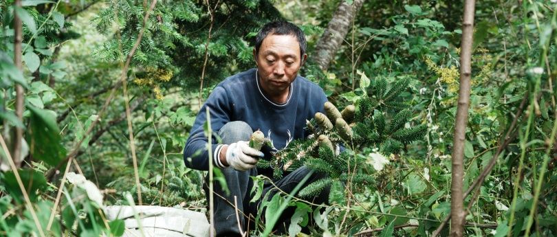 在八茨线附近山林,秦岭冷杉树干高大挺拔,枝头赤果在微风中微微颤动。工作人员系好安全绳,麻利地爬上树梢,用刀具截断带有赤果的枝头,再将坠落在地上的果实逐一捡拾、装袋。