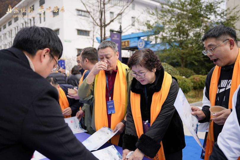 市集精心设计的“从一粒高粱到一滴酒”互动打卡集章环节引发参与热潮。市集分为“神农粮源区、古法酿造区、陈香坛藏区、匠心调香区、生态酱香区、品牌展示区”六大体验区,消费者们循着打卡动线,沉浸式了解从原料甄选、制曲、下沙发酵等传统酿造流程,参与DIY调酒及品鉴酱香特调,还与AI机器人酒祖神农氏进行趣味互动。参与者持活动手册探访各体验区完成互动,集齐六枚专属印章即可兑换价值238元的神农架酱酒金银酒版礼盒。