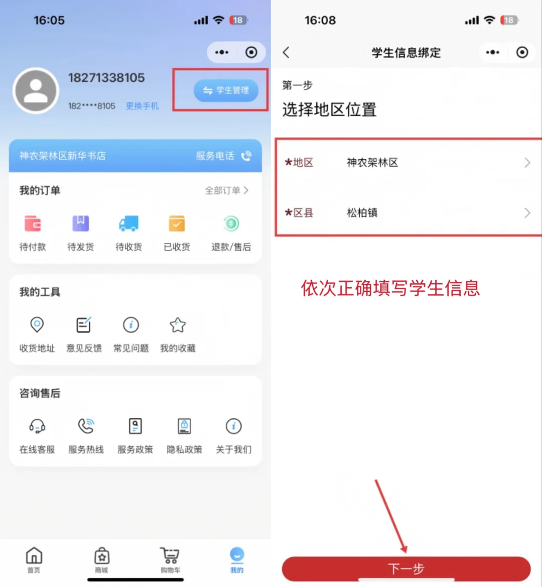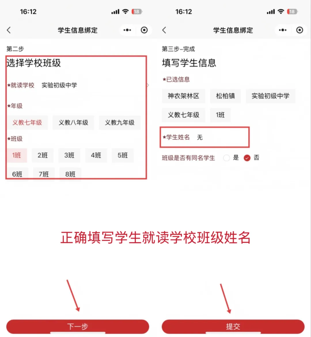 4.信息填写:扫码进入平台小程序(倍阅学习中心)后,确认学生在读学校信息,准确选择年级、班级,填写学生姓名。(身份证信息可不填写,如有同班同姓名的学生才必须填写),确保配送信息准确无误。若填写错误,点击“预售”-“学生信息”-“解绑”,重新录入即可。