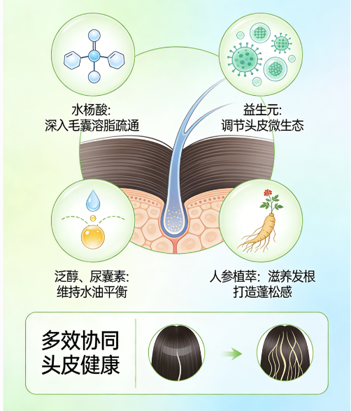 水杨酸(有效浓度0.3%),温和代谢头皮老废角质,疏通毛囊,减少油脂堆积,同时瓦解发丝表面附着的油脂,松解发丝黏连,让发丝摆脱厚重感,呈现轻盈状态。浓度精准控制,温和无刺激,避免过度代谢导致的头皮干涩。