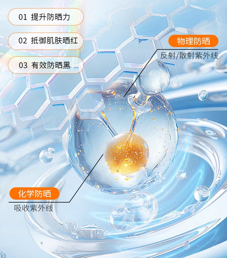 核心防晒成分采用甲氧基肉桂酸乙基己酯、奥克立林、水杨酸乙基己酯、苯基苯并咪唑磺酸、二氧化钛复配,化学防晒强效阻隔中波紫外线(UVB),物理防晒长效抵御长波紫外线(UVA),双重防护叠加,实现全波段防晒,SPF50+可抵御98%以上的紫外线,PA+++实现12小时长效防护,全天守护肌肤免受光损伤。
