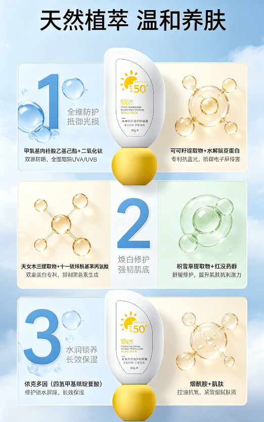 抗光损修护体系:进口积雪草提取物搭配德国红没药醇、埃及依克多因,舒缓紫外线引发的泛红不适,强韧肌肤屏障,降低防晒带来的刺激风险