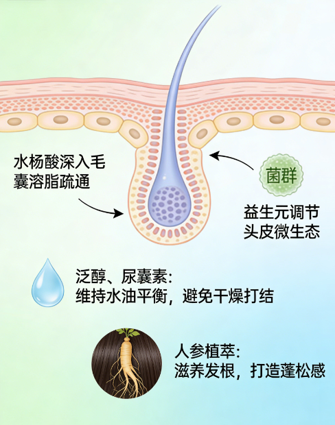 搭配丁二醇、1,2-己二醇(专利成分),高效锁住头皮水分,避免清洁后干燥紧绷;侧柏叶提取物辅助抑菌抗炎,改善头痒,为控油蓬松提供多重支撑。